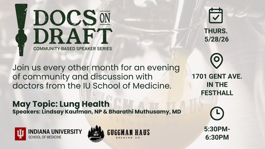 Docs on Draft is a new speaker series designed to engage community members in discussions about important health topics. Come and form genuine connections with local doctors through conversations free of judgment. Expert physicians and scientists from IU School of Medicine will present on a topic while sharing their knowledge, engaging in dialogue and storytelling, and answering your questions.