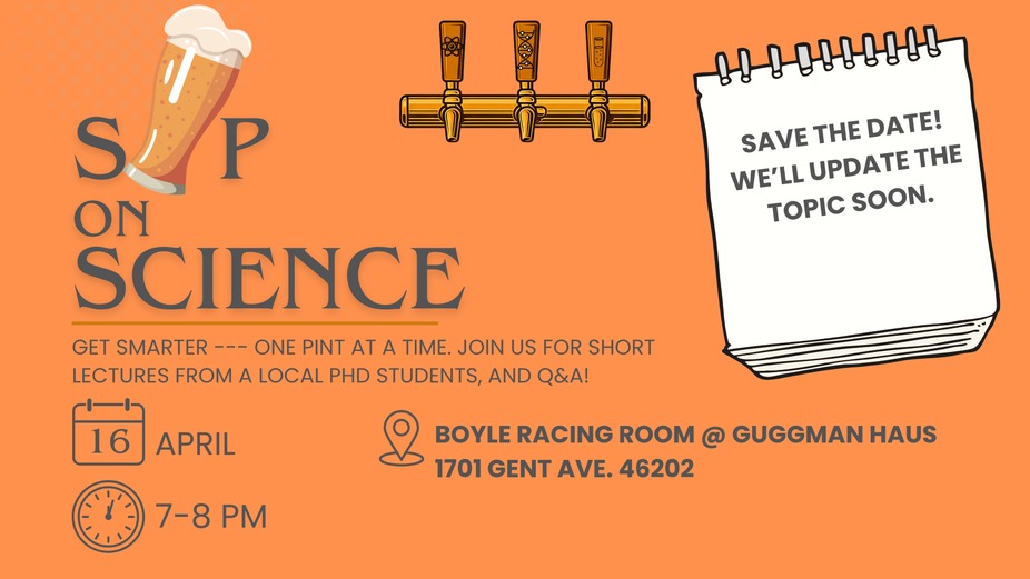 Save the date and join us for our next Sip on Science! Join us Thursday, April 16th from 7-8pm as local PhD students give short lectures on informational topics in the science realm. We'll update with our April topic soon!