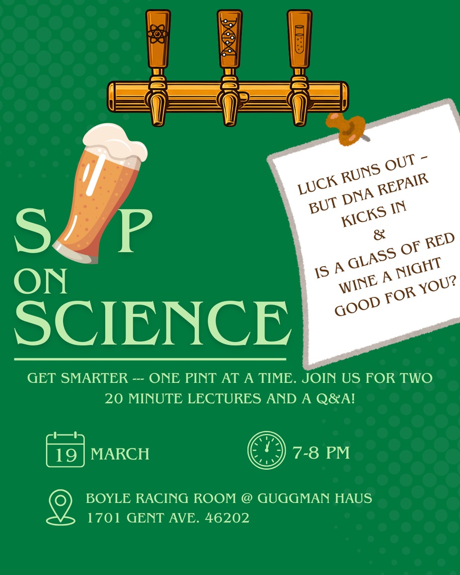 Save the date and join us for our next Sip on Science! Join us Thursday, March 19th from 7-8pm as local PhD students give a short lecture on informational topics in the science realm.