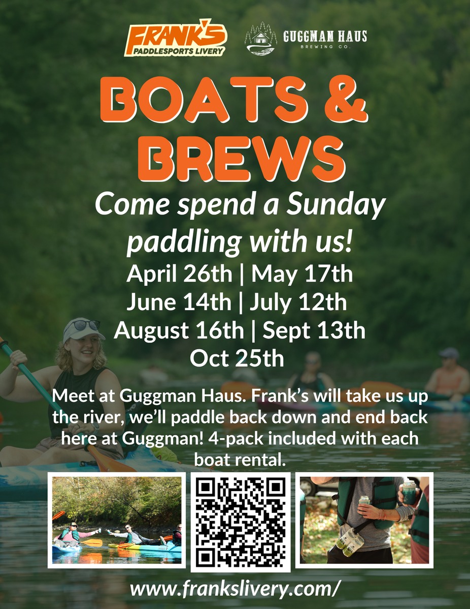 Come paddle with us! Guggman Haus & Frank's Paddlesports Livery, both located in the heart of the Riverside neighborhood here in Indianapolis, have partnered to bring you Boats & Brews for the 2026 season!